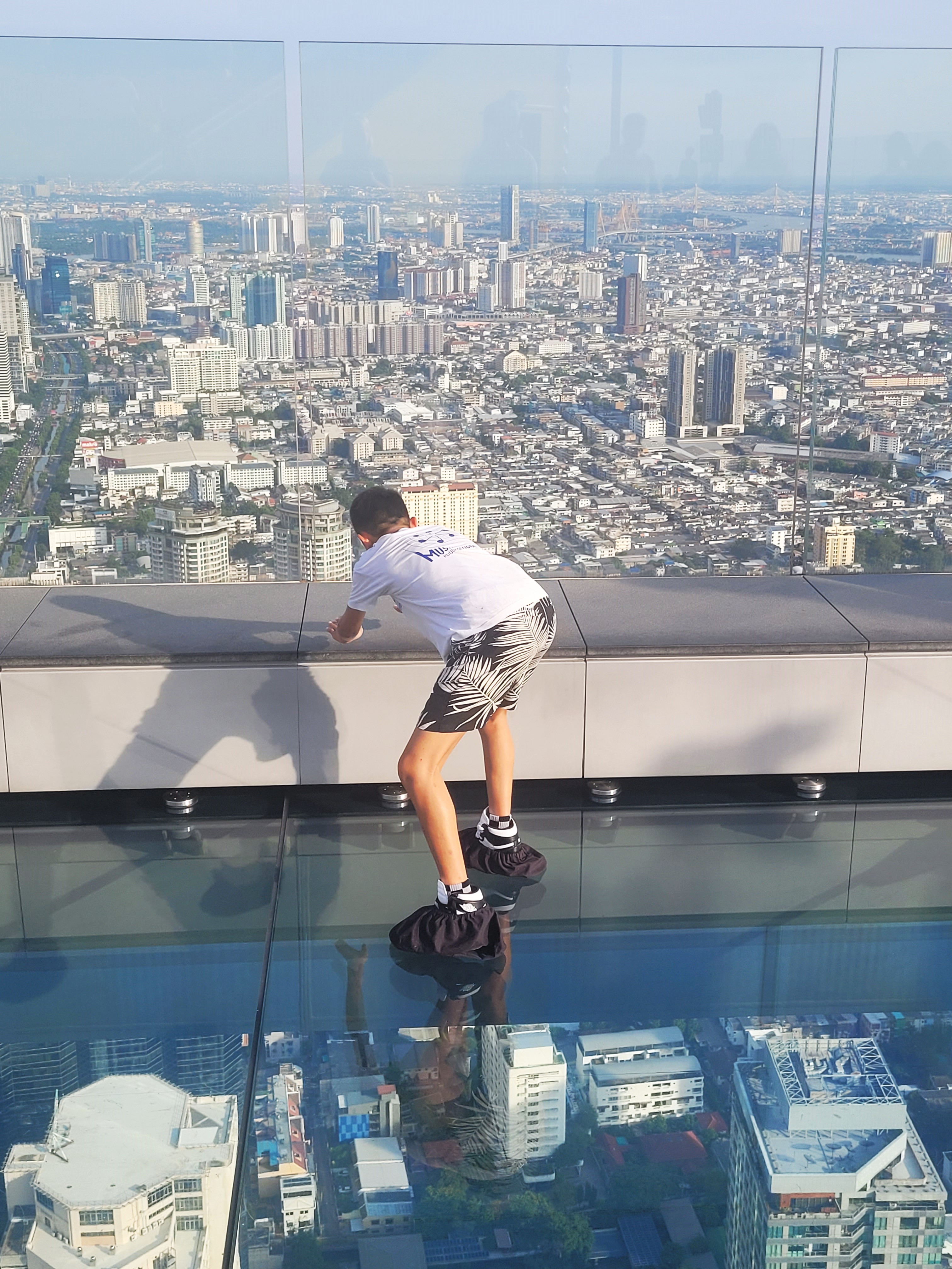 Ostosten jälkeen kävelimme skytrain asemalle ja menimme Samuelin toiveesta Mahanakhonille. Olemme aiemminkin käyneet Mahanakhonissa katselemassa Bangkokia yläilmoista käsin, joten Tomi ja Olivia jäivät alas odottelemaan, kun minä ja Samuel menimme hissillä korkeuksiin. Samuelia vähän jännitti tornin lasilattialla kävely, minä en tälläkään kertaa uskaltanut mennä kävelemään lasilattian päälle. Ostin Mahanakhonin liput aulan automaatista luottokortilla ja luottokortilta on veloitettu 36euroa eli siihen hintaan pääsi yksi aikuinen ja yksi lapsi Mahanakhonin huipulle. Ostin halvimmat liput ja siihen ei kuulunut juomia tai muitakaan lisäpalveluja.